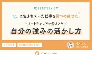 志望動機が思いつかない時、また自信を持って志望動機を伝えたいときに、相談すべきなのがミートキャリアが提供しているキャリア相談。キャリア相談はキャリアコンサルタント(国家資格)をはじめとした様々な経歴を持ったキャリアの専門家がキャリアの軸を持つ支援や応募先企業のリサーチなどを全面的にサポートしてくれます。